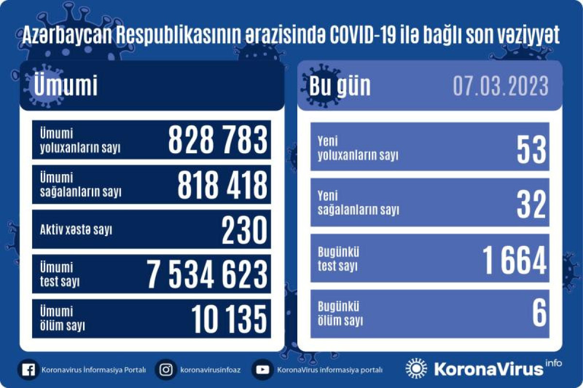 Azərbaycanda daha 53 nəfər COVID-19-a yoluxub, 6 nəfər vəfat edibAzərbaycan Respublikasında koronavirus (COVID-19) infeksiyasına 53 yeni yoluxma faktı qeydə alınıb, 32 nəfər müalicə olunaraq sağalıb.