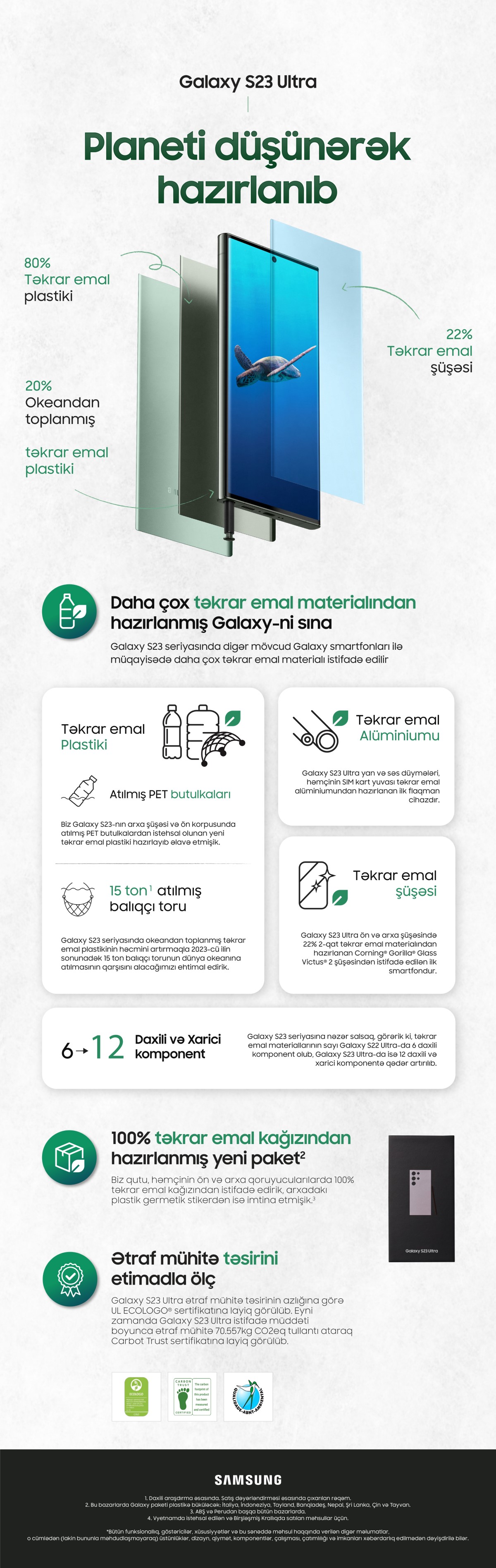 Galaxy S23 seriyasının nümunəsində innovasiya və davamlılığın birlikdə necə qüsursuz işlədiyini görmək üçün aşağıdakı infoqrafikaya baxın.