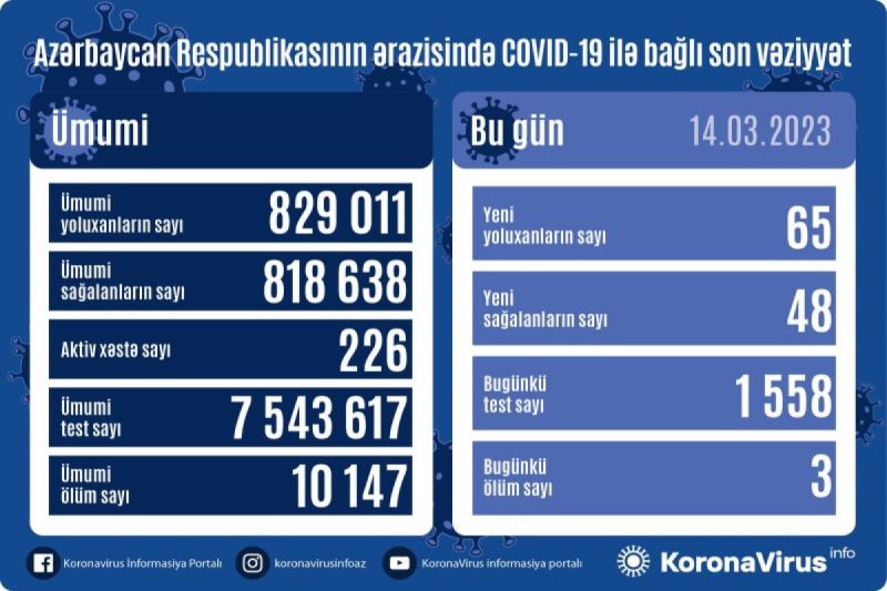 Azərbaycan Respublikasında koronavirus (COVID-19) infeksiyasına 65 yeni yoluxma faktı qeydə alınıb, 48 nəfər müalicə olunaraq sağalıb.