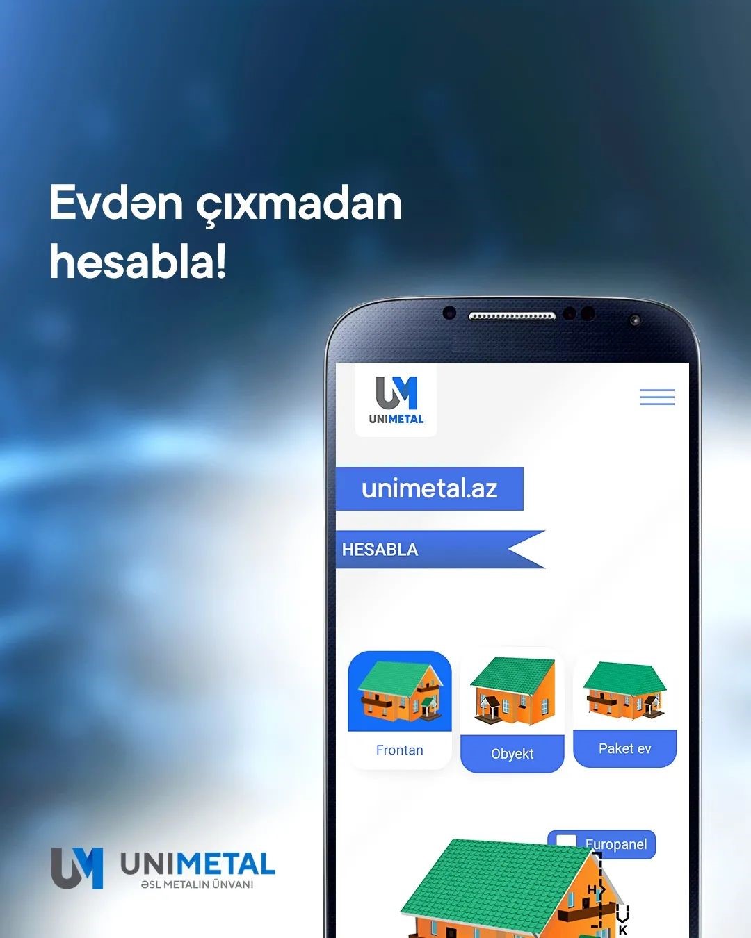 İstifadəyə verilən mobil proqram ilə inşa edilən ev, obyekt və digər tikililər üçün hansı miqdarda dam örtüyü lazım olduğunu hesablamaq mümkündür.(®) Həyatın bütün sahələrində müxtəlif yeniliklərin tətbiq olunduğu müasir dövrümüz iqtisadiyyatın aparıcı qollarından olan istehsal və tikinti sektorunun da bu yeniliklərə uyğunlaşmasını zəruri etməkdədir. Azərbaycanda 25 ildən artıq müddətdir ki əsasən tikintidə istifadə olunan müxtəlif metal məmulatlarının istehsalçısı və tədarükçüsü rolunda çıxış edən Unimetal şirkəti öz sahəsində yeniliklərin tətbiqi üçün daimi olaraq müxtəlif həll yollarının axtarışındadır.