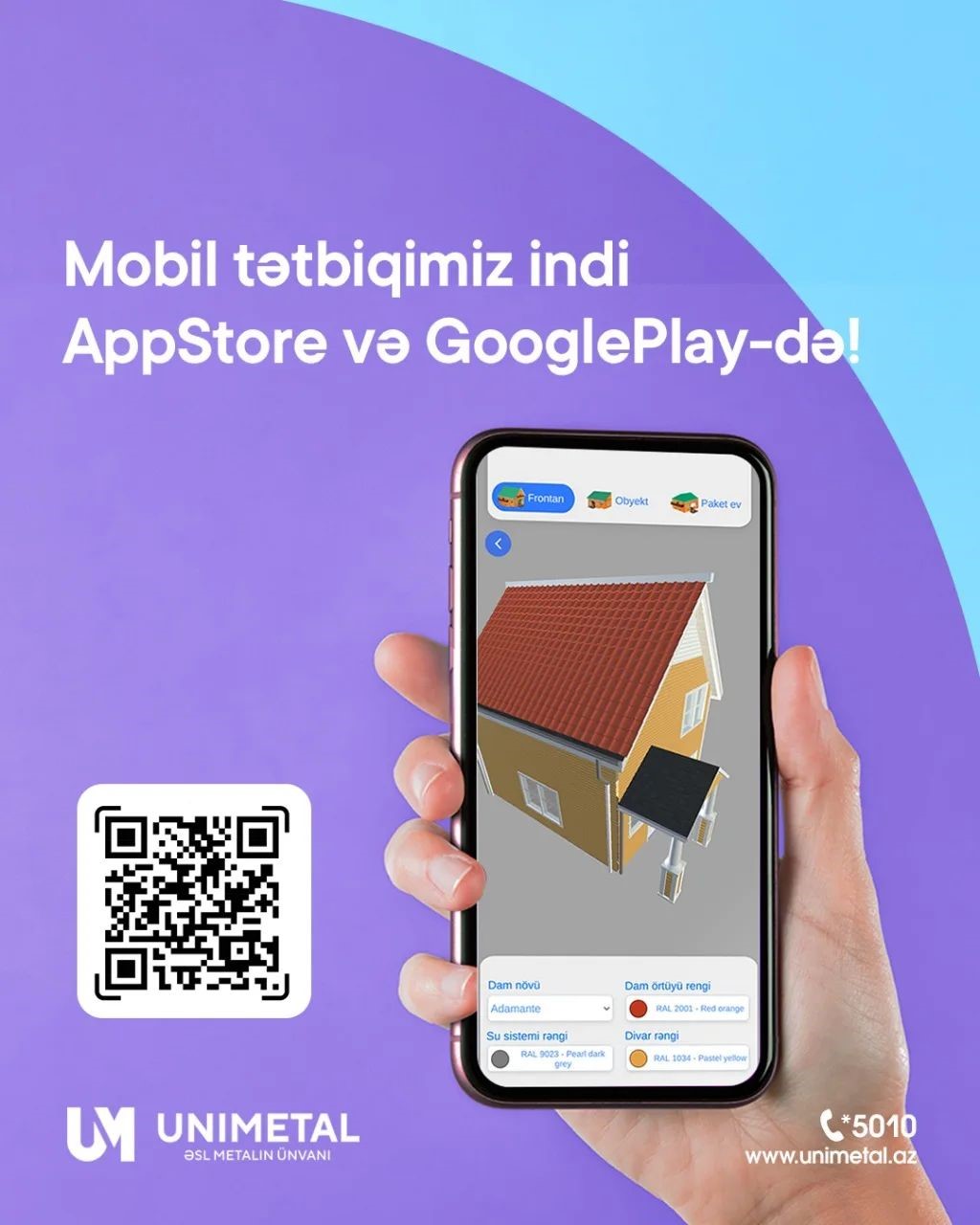 Belə ki, Unimetal Azərbaycanda ilk dəfə olaraq bir çox özəllikləri özündə cəmləşdirən mobil tətbiqi istifadəyə vermişdir. Bu tətbiqin digərlərindən üstünlüyü ondan ibarətdir ki, burada dam örtüyü məhsulları üzrə “HESABLA” və “DİZAYN EDİN” bölmələri əlavə olunmuşdur. Bununla da, istifadəçilərin inşa etdikləri ev, obyekt və digər tikililərə görə, onlara hansı miqdarda dam örtüyü məhsulu lazım olduğunu əvvəlcədən hesablatmaq üçün kiməsə müraciət etmələrinə ehtiyyac qalmır. Bunun üçün App Store və ya Google Play Store üzərindən mobil əlavəni yükləmək və tətbiq daxilindəki müvafiq bölməyə keçid edib, tikilinin real ölçülərini daxil etmək kifayət edəcəkdir.