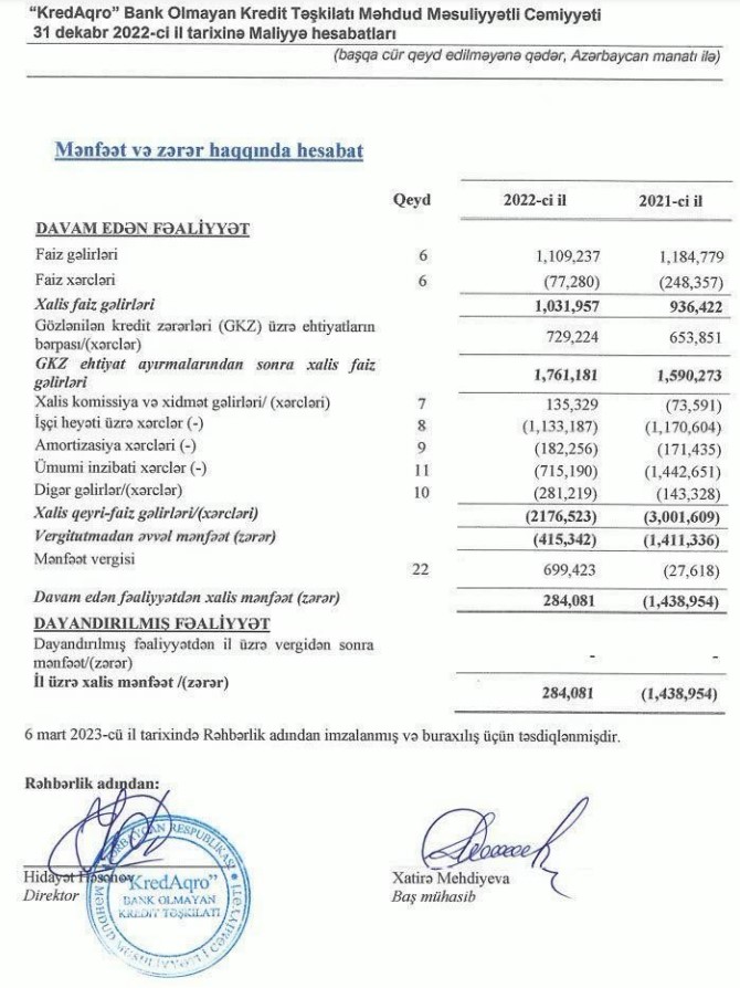 "KredAqro" Bank Olmayan Kredit Təşkilatı MMC 2022-ci ili 284 min manat xalis mənfəət ilə başa vurub. Halbuki, təşkilat 2021-ci ili 1 milyon 439 min manat xalis zərər ilə bağlamışdı.