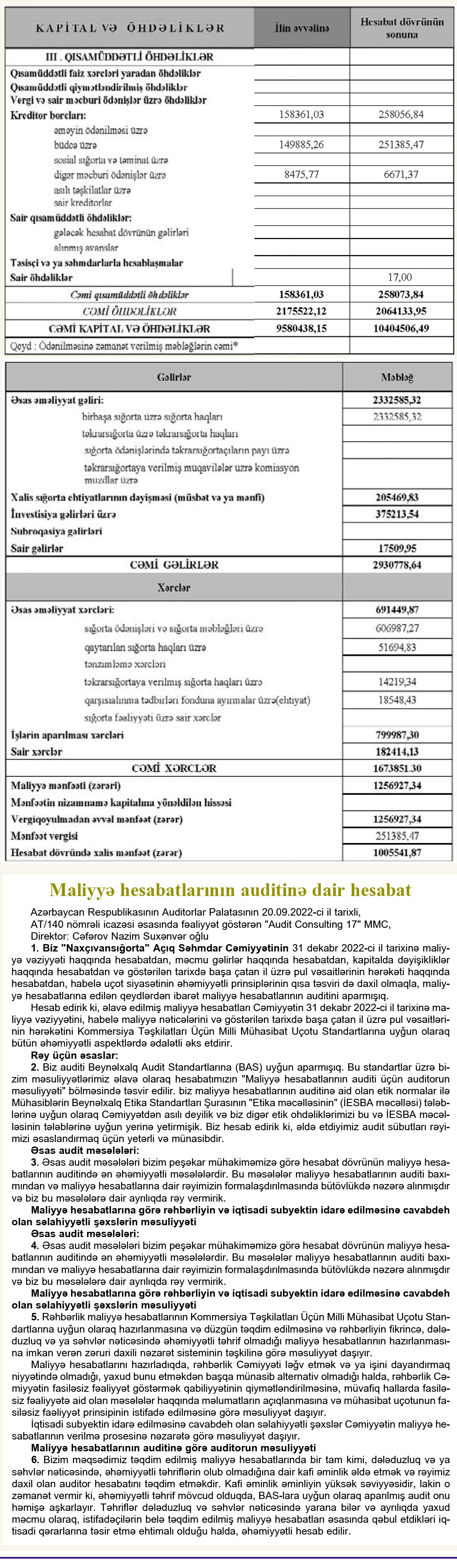 "Naxçıvan Sığorta" ötən ili 1 milyon manatdan çox xalis mənfəət ilə başa vurub