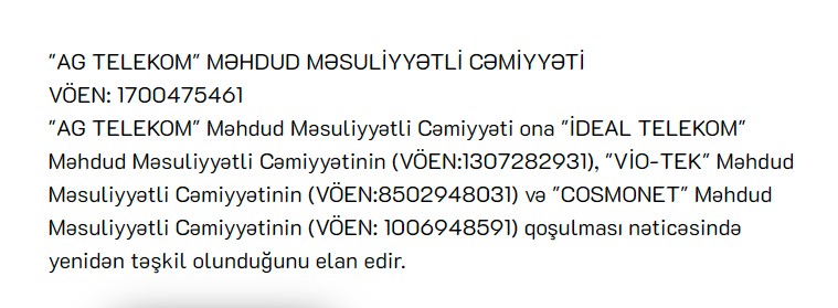 "AG Telekom" Məhdud Məsuliyyətli Cəmiyyəti ona "İdeal Telekom" Məhdud Məsuliyyətli Cəmiyyətinin, "Vio-Tek" Məhdud Məsuliyyətli Cəmiyyətinin və "Cosmonet" Məhdud Məsuliyyətli Cəmiyyətinin qoşulması nəticəsində yenidən təşkil olunduğunu elan edib.
