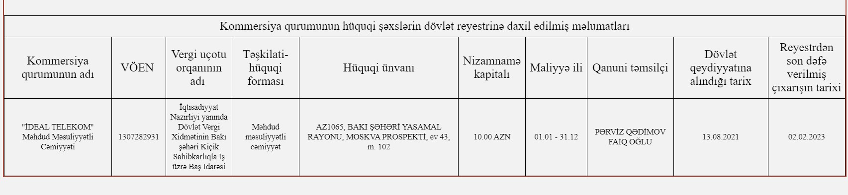 "Cosmonet" 2021-ci ildə yaradılıb və nizamnamə kapitalı 200 min manatdır. 10 manat nizamnamə kapitalı olan "Vio-Tek" 2018-ci ildə, 10 manat nizamnamə kapitalı olan "İdeal Telekom" isə 2021-ci ildə dövlət qeydiyyatına alınıb."Vio-Tek" MMC-nin hüquqi ünvanı Şəmkirdə, digər şirkətlərin hüquqi ünvanı isə Bakı şəhərindədir.