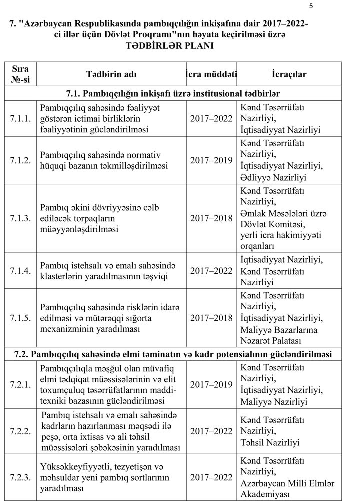 3.2.2. pambıqçılıq sahəsində fəaliyyəti tənzimləyən normativ hüquqi bazanın təkmilləşdirilməsi;