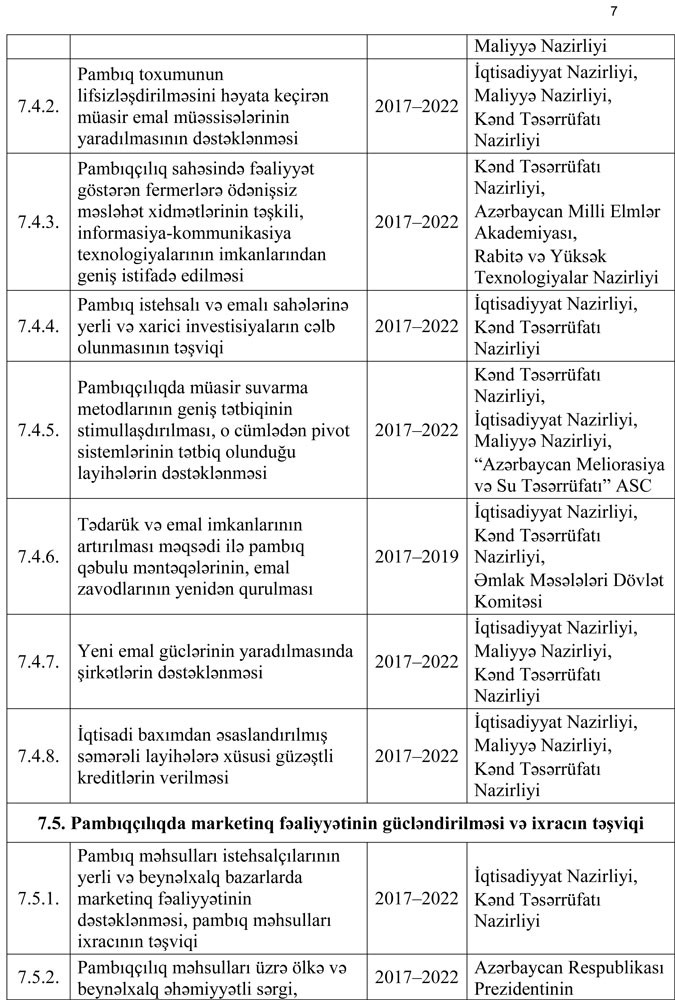 6.2. Eyni zamanda, görülən tədbirlər nəticəsində qabaqcıl texnologiyaların geniş tətbiqinə əsaslanan pambıq istehsalı və emalı kompleksi təşəkkül tapacaq, yerli pambıq xammalına əsaslanan tekstil sənayesi formalaşacaqdır.
