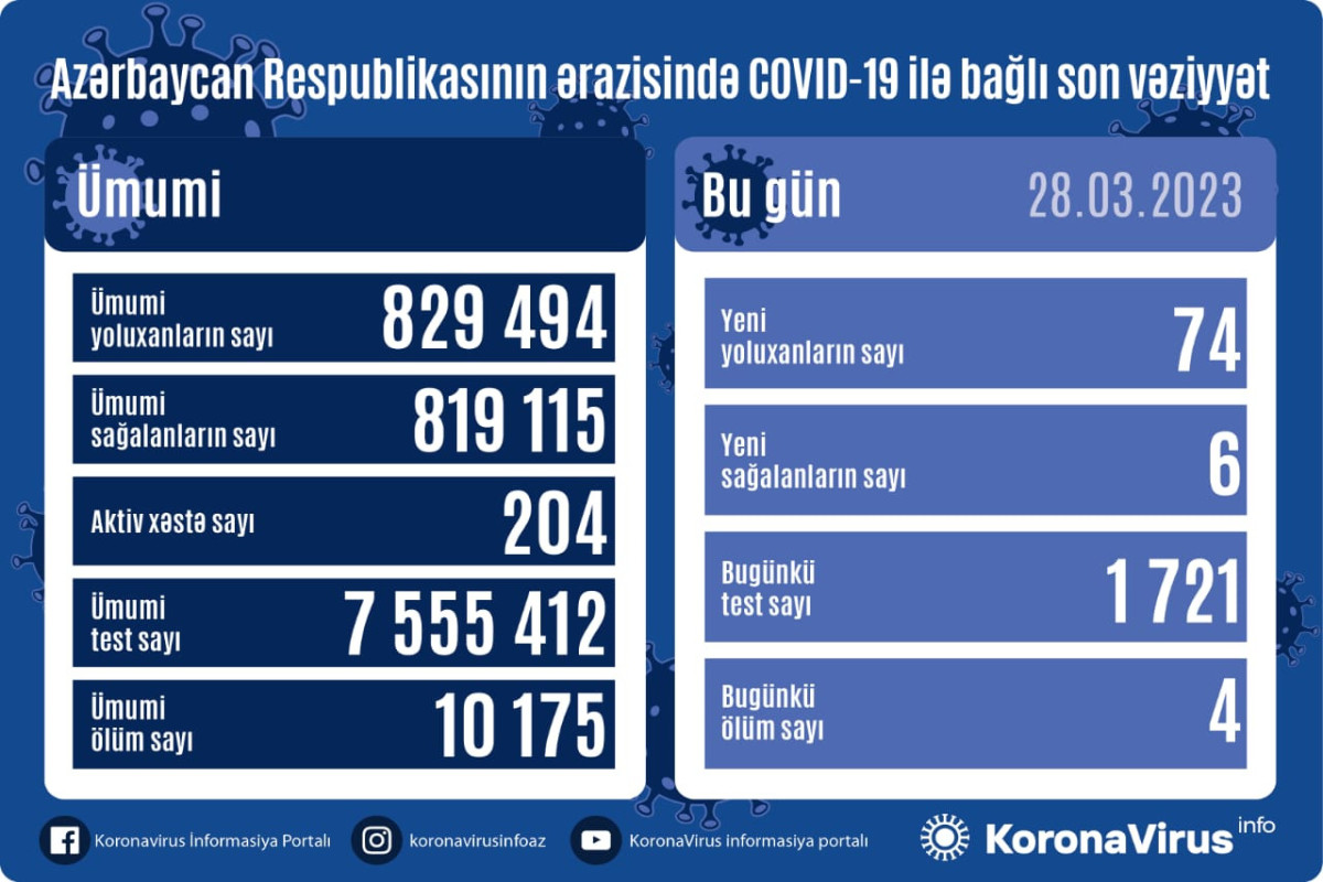 Azərbaycan Respublikasında koronavirus (COVID-19) infeksiyasına 74 yeni yoluxma faktı qeydə alınıb, 6 nəfər müalicə olunaraq sağalıb.