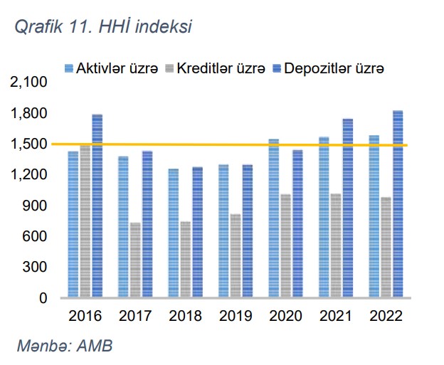 Qeyd edilib ki, beynəlxalq təcrübədə geniş istifadə olunan HHI indeksi son illər aktiv və depozitlər üzrə təmərküzləşmədə artım, kreditlər üzrə isə azalma müşahidə edildiyini göstərir. Bununla belə, 2022-ci ilin sonu üzrə bank sektorunda təmərküzləşmə aktivlər və depozitlər üzrə orta (müvafiq olaraq 1584 və 1819) və kredit portfeli üzrə isə aşağı (982) səviyyədə olmuşdur.