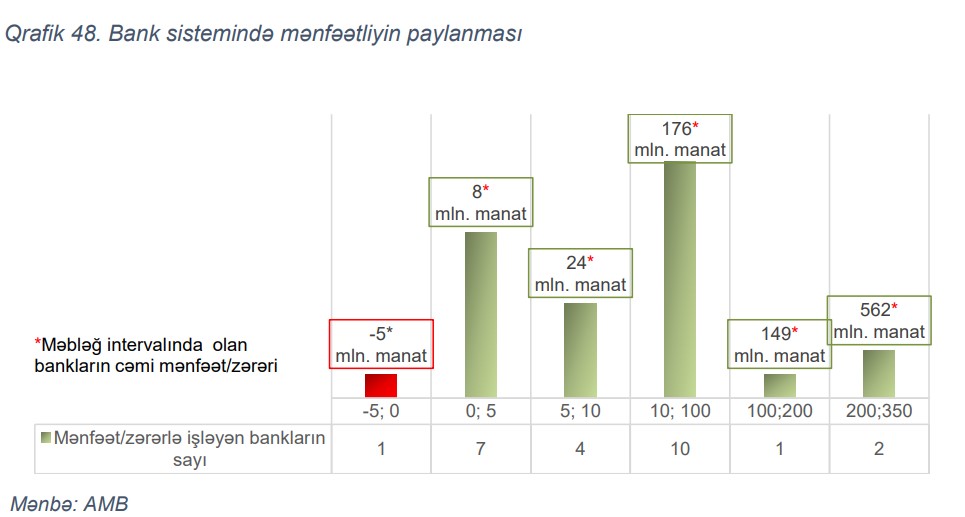 Qeyd edilib ki, sektorda mənfəətlə işləyən bankların sayının artmasına baxmayaraq mənfəətliyin təmərküzləşməsi müşahidə olunur. Sektorun xalis mənfəətinin 78%-i aktivlərin 65%-i özündə cəmləşdirən 3 bankda təmərküzləşmişdir.