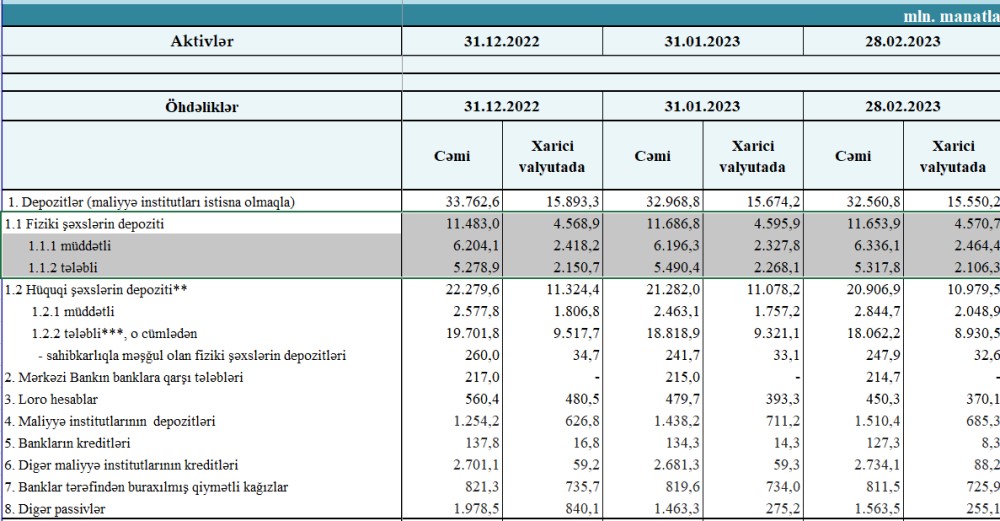 2023-cü ilin yanvar ayının sonu ilə müqayisədə fevral ayında əhalinin banklardakı müddətli əmanətləri 139 milyon 780 manat artaraq 28 fevral 2023-cü il tarixində 6 milyard 336 milyon 71 min manata çatıb.Bilindiyi kimi, 01.02.2023-cü il tarixindən etibarən fiziki şəxslərin əmanət üzrə faiz gəlirləri Vergi Məcəlləsinə əsasən 10% gəlir verigisinə cəlb olunur. Əmanət üzrə faiz gəlirlərinin vergiyə cəlb edilməsi fevral ayında fiziki şəxslərin (əhalinin) banklardakı müddətli əmanətlərinin azalması ilə nəticələnməyib.