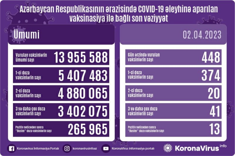 Azərbaycanda son sutkada koronavirus (COVID-19) əleyhinə 448 vaksin vurulub. Bir gündə birinci mərhələ üzrə vaksinasiya olunanların sayı 374, ikinci mərhələ üzrə vaksinasiya olunanların sayı 20, üç və daha çox doza üzrə vaksinasiya olunanların sayı 41, pozitiv nəticədən sonra buster doza üzrə vaksinasiya olunanların sayı 13 nəfərdir.