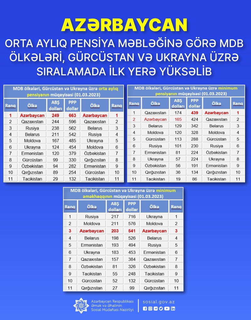 Qeyd edilib ki, eyni zamanda, ölkəmiz minimum və orta aylıq pensiya göstəricilərinin Alıcılıq Qabiliyyəti Pariteti əsasında hesablanmış dollar ifadəsində həmin sıralamada ilk yeri tutmaqda davam edir.