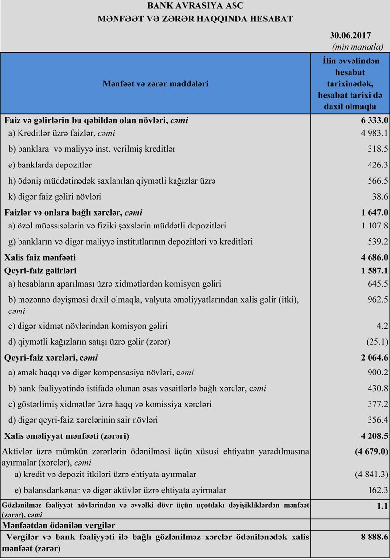 “Bank Avrasiya” ASC 2017-ci ilin birinci yarısını təxminən 8,9 milyon manat xalis mənfəət ilə başa vurub.