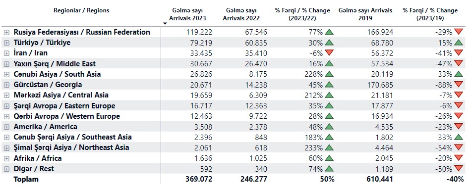 Gəlmə sayına görə, 2022-ci illə müqayisədə ən çox artım Şimal Şərqi Asiya (233 %), Cənubi Asiya (228 %), Mərkəzi Asiya (212 %) və Cənub Şərqi Asiya (183 %) regionunun payına düşüb.