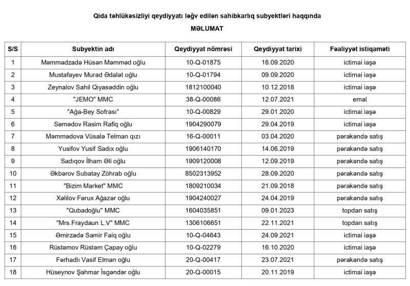 Marja xəbər verir ki, 2023-cü ilin Mart ayında AQTA tərəfindən 76 sahibkarlıq subyektinin "Qida təhlükəsizliyi qeydiyyatı" ləğv edilib.