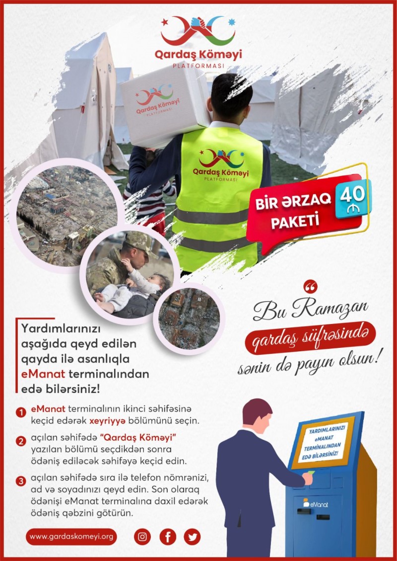 Bu mübarək Ramazan ayındasahib olduqlarımızı qardaşlarımızla paylaşaraq daha çox savab qazanma fürsətini qaçırmayaq! Yardımlarınızı rahatlıqla E-manat ödəmə terminalları və ya verilən linkə daxil olaraq olduğunuz yerdən həyata keçirə bilərsiniz; http://bit.ly/3zSU7MA