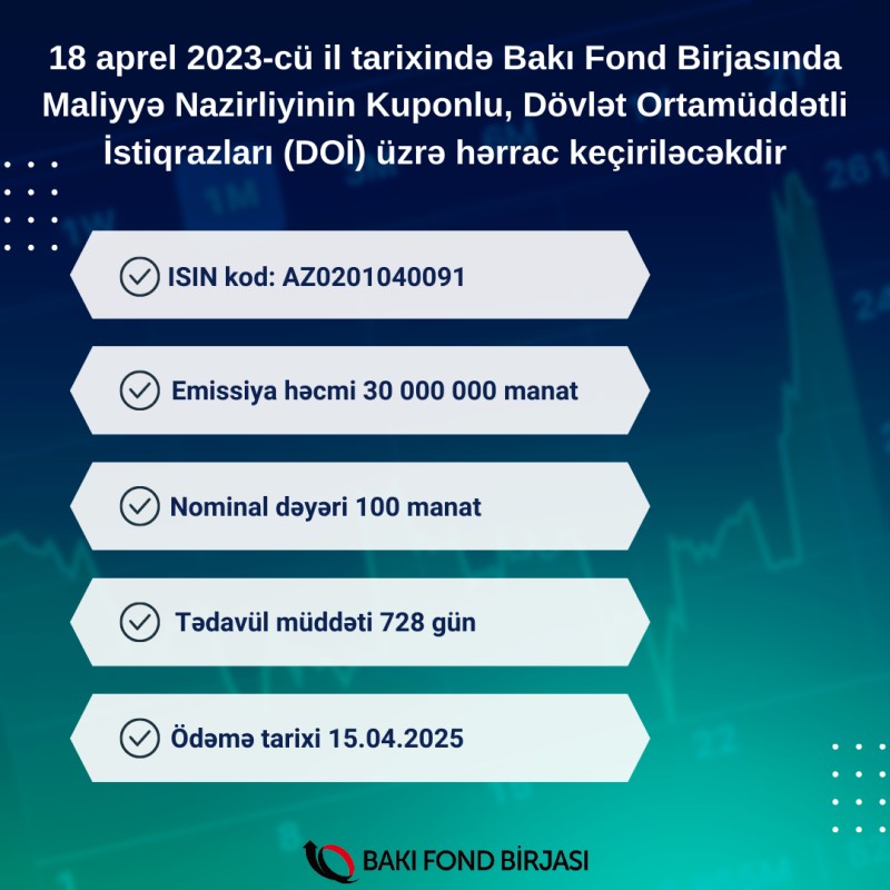 18 aprel 2023-cü il tarixində Bakı Fond Birjasında Maliyyə Nazirliyinin Kuponlu, Dövlət Ortamüddətli İstiqrazları (DOİ) üzrə hərrac keçiriləcəkdir.