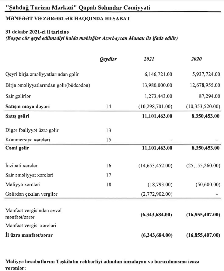 "Şahdağ Turizm Mərkəzi" QSC 2021-ci ili 6 milyon 344 min manat xallis zərər ilə başa vurub. Şirkət 2020-ci ili 16 milyon 855 min manat xalis zərər ilə bağlamışdı. Beləliklə, 2020-ci illə müqayisədə 2021-ci ildə Mərkəzin zərəri 2,7 dəfə azalır.