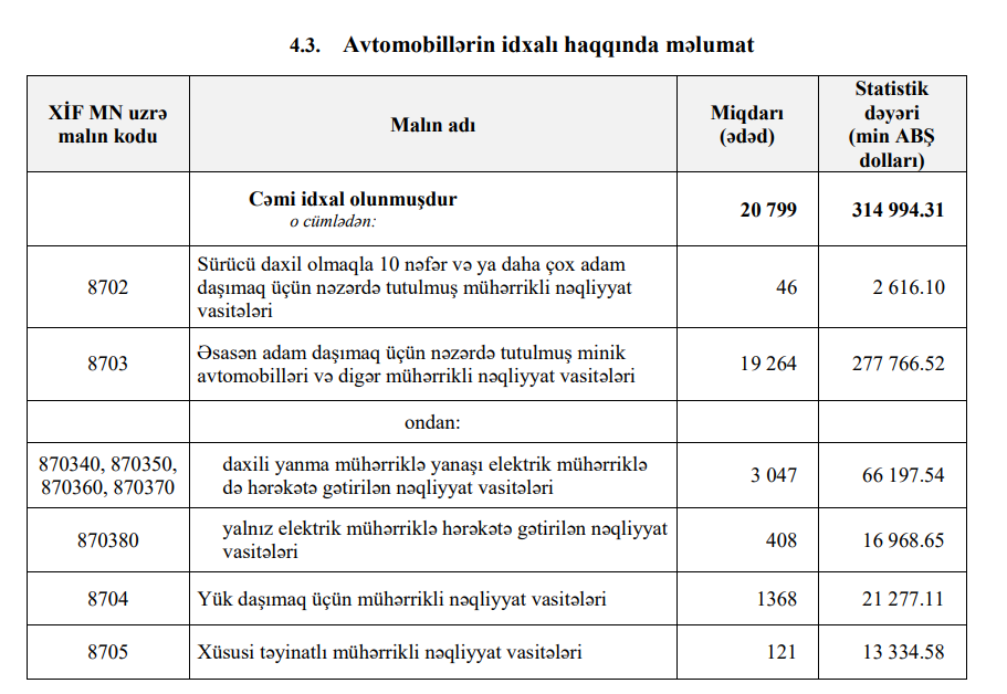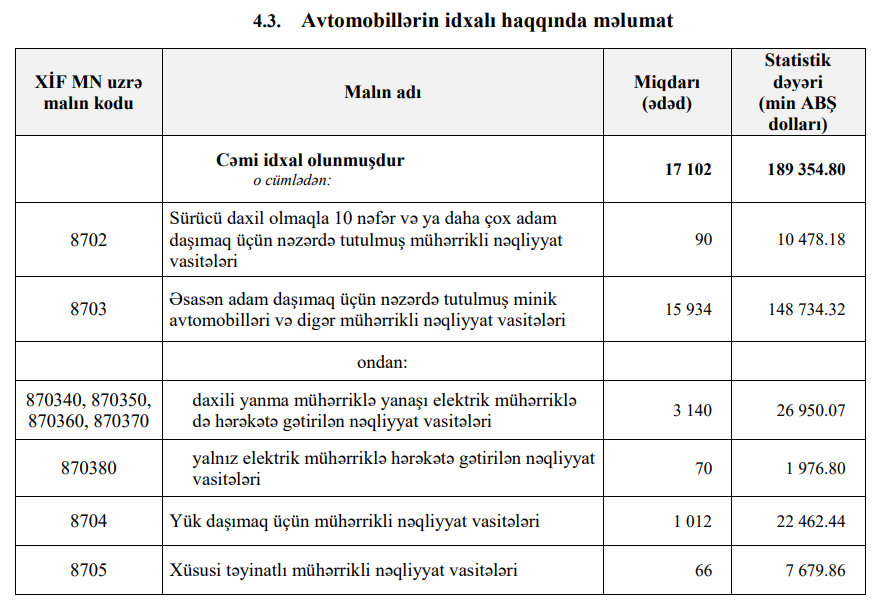Həmçinin, 2023-cü ilin ilk 3 ayında Azərbaycana 3 min 47 ədəd daxili yanma mühərriklə yanaşı elektrik mühərriklə də hərəkətə gətirilən nəqliyyat vasitələri (hibrid) gətirilib. Ötən ilin eyni dövründə bu say 3 min 140 ədəd idi.