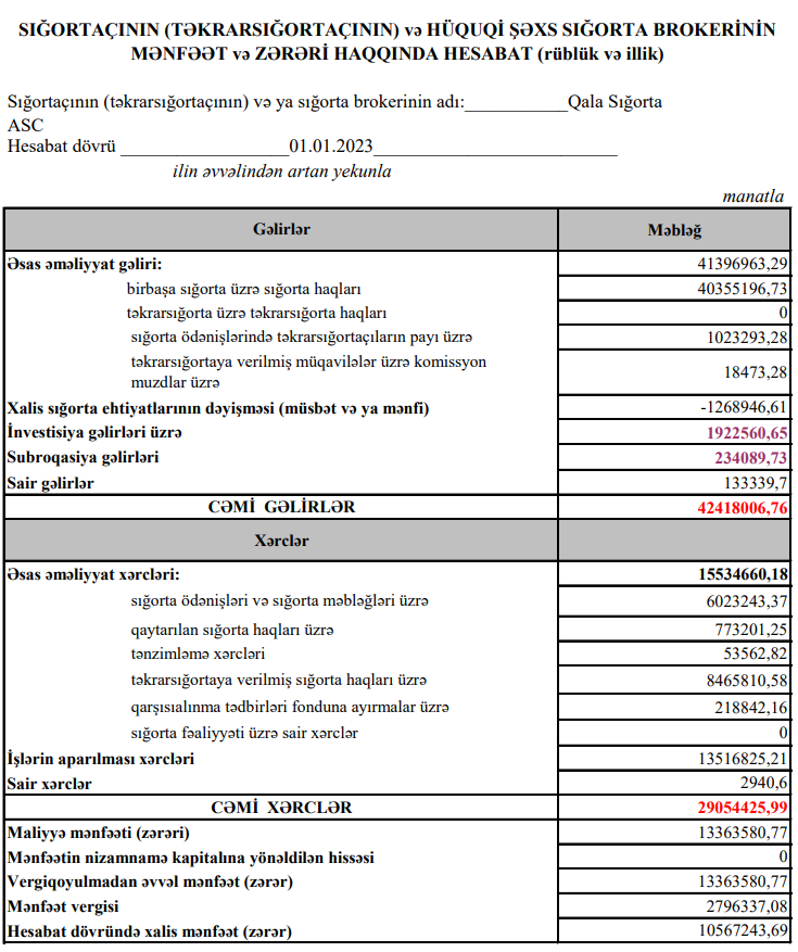 "Qala Sığorta" şirkətinin cəmi gəlirlərinin azalmasına xalis sığorta ehtiyatlarının dəyişməsi, hesablanan sığorta haqlarının geriləməsi, xərclərinin azalmasına isə təkrarsığortaya verilmiş sığorta haqları üzrə xərclərin düşməsi təsir göstərib.