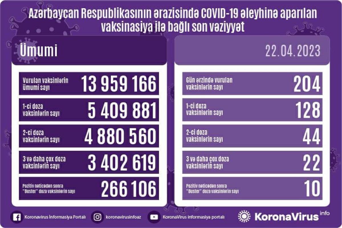 Azərbaycanda son sutkada koronavirus (COVID-19) əleyhinə 204 vaksin vurulub.