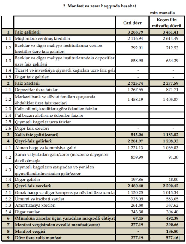 Müqayisə üçün qeyd edək ki, 2022-ci ilin yanvar-mart dövründə "Günay Bank"ın cəmi əməliyyat gəlirləri 4 milyon 669 min manat, cəmi əməliyyat xərcləri 4 milyon 567 min manat, əməliyyat mənfəəti 102 min manat təşkil etmişdi. Ehtiyata 492 min manat ayırdığından və 187 min manat mənfəət vergisi ödədiyindən "Günay Bank"ın 577 min manat xalis zərəri yaranmışdı.