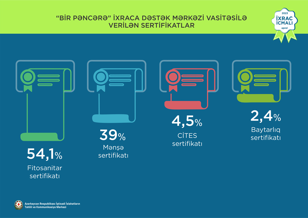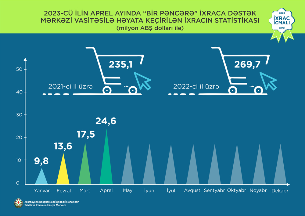 “İxrac İcmalı”nda göstərilib ki, 2023-cü ilin aprel ayında “Bir Pəncərə” İxraca Dəstək Mərkəzi vasitəsilə həyata keçirilən qeyri-neft ixracının dəyəri 24,6 milyon ABŞ dolları olub.