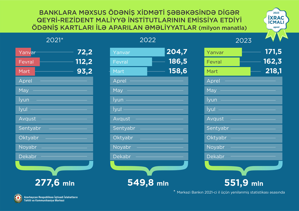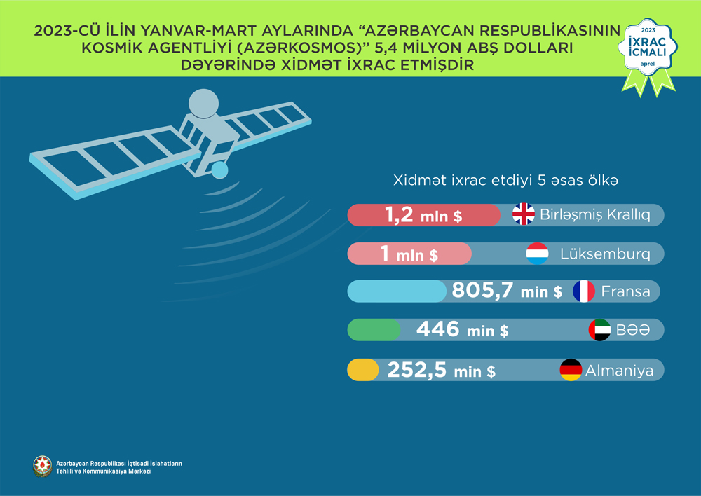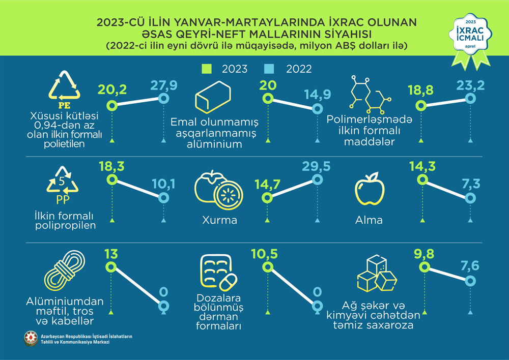 İqtisadi İslahatların Təhlili və Kommunikasiya Mərkəzinin hazırladığı “İxrac icmalı”nın aprel sayına əsasən, 2023-cü ilin yanvar-mart aylarında Azərbaycanın ümumi ixracı 7,7 milyard ABŞ dolları, qeyri-neft sektoru üzrə ixrac 912,2 milyon ABŞ dolları təşkil edib. Qeyri-neft sektoru üzrə ixrac 2022-ci ilin üç ayı ilə müqayisədə 23,2% artıb.