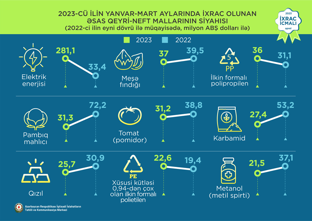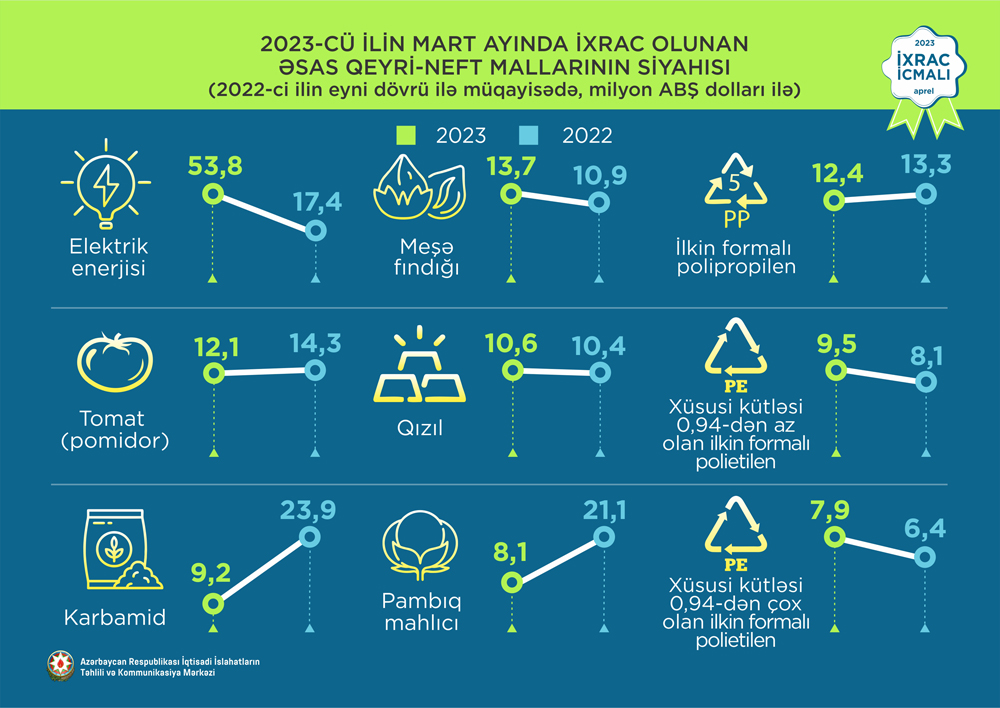 2023-cü ilin yanvar-mart ayları ərzində ixrac edilən qeyri-neft sektoruna aid malların siyahısında elektrik enerjisi (281,1 milyon ABŞ dolları) birinci olub. Bu siyahıda meşə fındığı ixracı (37 milyon ABŞ dolları) ikinci, ilkin formalı polipropilen (36 milyon ABŞ dolları) isə üçüncü yerdə qərarlaşıb.