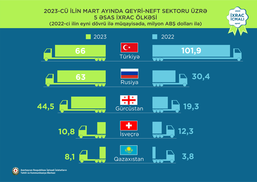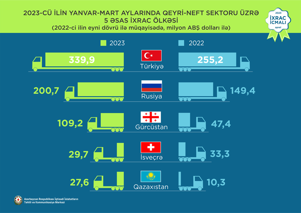 2023-ci ilin yanvar-mart ayları ərzində Türkiyəyə 339,9 milyon ABŞ dolları, Rusiya Federasiyasına 200,7 milyon ABŞ dolları, Gürcüstana 109,2 milyon ABŞ dolları, İsveçrə Konfederasiyasına 29,7 milyon ABŞ dolları, Qazaxıstana isə 27,6 milyon ABŞ dolları dəyərində qeyri-neft sektoruna aid mal ixrac olunub.