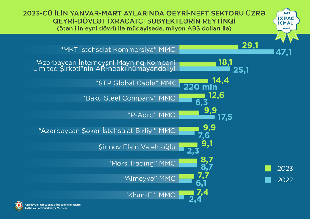 Bu reytinqdə qeyri-dövlət ixracatçı subyektləri arasında ilk onluqda təmsil olunan şirkətlər bunlardır: “MKT İstehsalat Kommersiya” MMC, “Azərbaycan İnterneyşnl Mayninq Kompani Limited Şirkəti”nin Azərbaycan Respublikasındakı Nümayəndəliyi, “STP Global Cable” MMC, “Baku Steel Company” QSC, “P-Aqro” MMC, “Azərbaycan Şəkər İstehsalat Birliyi” MMC, Şirinov Elvin Valeh oğlu, “Mors Trading” MMC, “Almeyvə” MMC, “Khan-El” MMC.