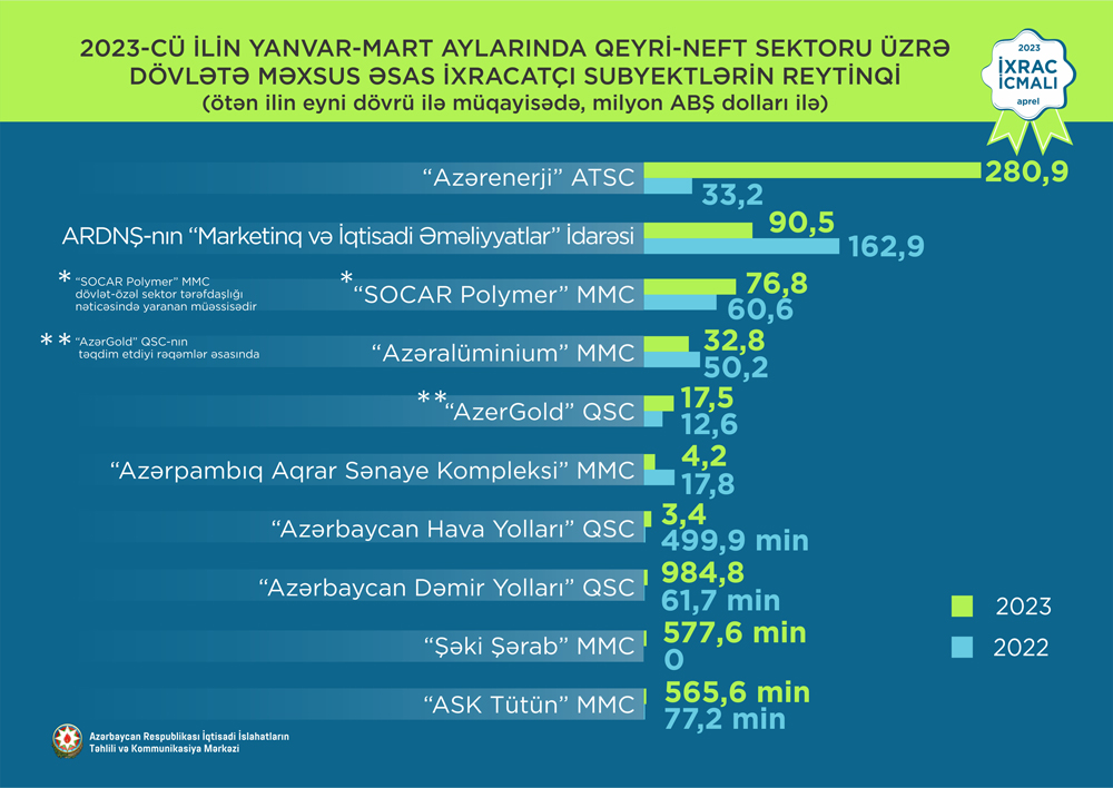Qeyri-neft sektoru üzrə ixrac əməliyyatlarında iştirak edən dövlətə məxsus olan şirkətlərin siyahısına isə “Azərenerji” ATSC başçılıq edir. Siyahıda təmsil olunan digər şirkətlər isə bunlardır: SOCAR-ın “Marketinq və İqtisadi Əməliyyatlar İdarəsi, “SOCAR Polymer” MMC, “Azəralüminium” MMC, “AzerGold” QSC, “Azərpambıq Aqrar Sənaye Kompleksi” MMC, “Azərbaycan Hava Yolları” QSC, “Azərbaycan Dəmir Yolları” QSC, “Şəki Şərab” MMC, “ASK Tütün” MMC.