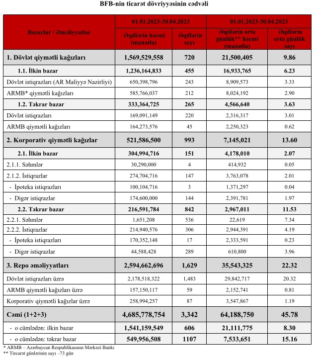 Bakı Fond Birjasında 2023-cü ilin yanvar- aprel ayı ərzində qiymətli kağızlar üzrə keçirilən əməliyyatların ümumi həcmi 4 milyard 685 milyon 779 min manat təşkil edib.