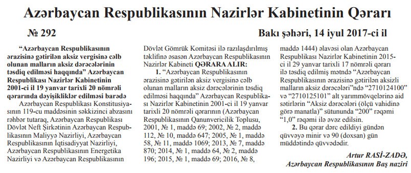 Dəyişiklik ilə, Azərbaycana gətirilən mühərrik benzinləri, aviasiya benzinləri istisna olmaqla, tərkibində qurğuşunun miqdarı 0,013 q/l-dən çoxolmayan, 95-dən az oktan ədədi ilə və mühərrik benzinləri, aviasiya benzinləri istisna olmaqla, tərkibində qurğuşunun miqdarı 0,013 q/l-dən çox, 95-dən az oktan ədədi ilə benzinlər (o cümlədən 92 oktan ədədi ilə benzinə) üçün aksiz dərəcələri 1 ton üçün 200 manatdan 1 manata endirilib.
