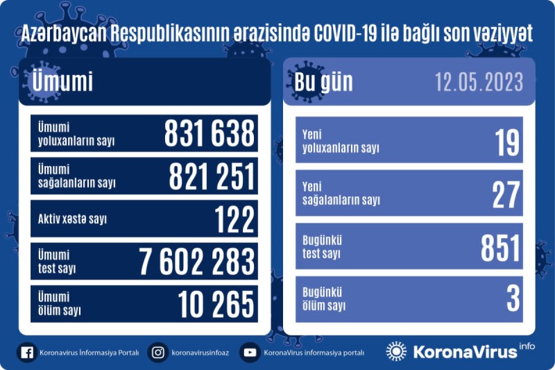 Azərbaycan Respublikasında koronavirus (COVID-19) infeksiyasına 19 yeni yoluxma faktı qeydə alınıb, 27 nəfər müalicə olunaraq sağalıb.