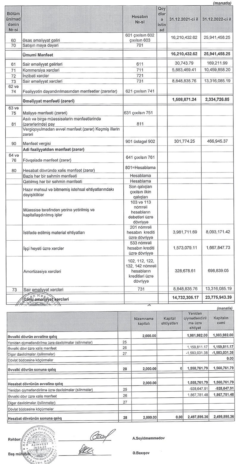 Marja.az xəbər verir ki, 2021-ci ildə "Azinvest İnşaat"ın əsas əməliyyat gəlirləri 16 milyon 210 min manat (satış) ikən, 2022-ci ildə 25 milyon 941 min manata çatıb (9 milyon 731 min manat və ya 37,5% artıb).