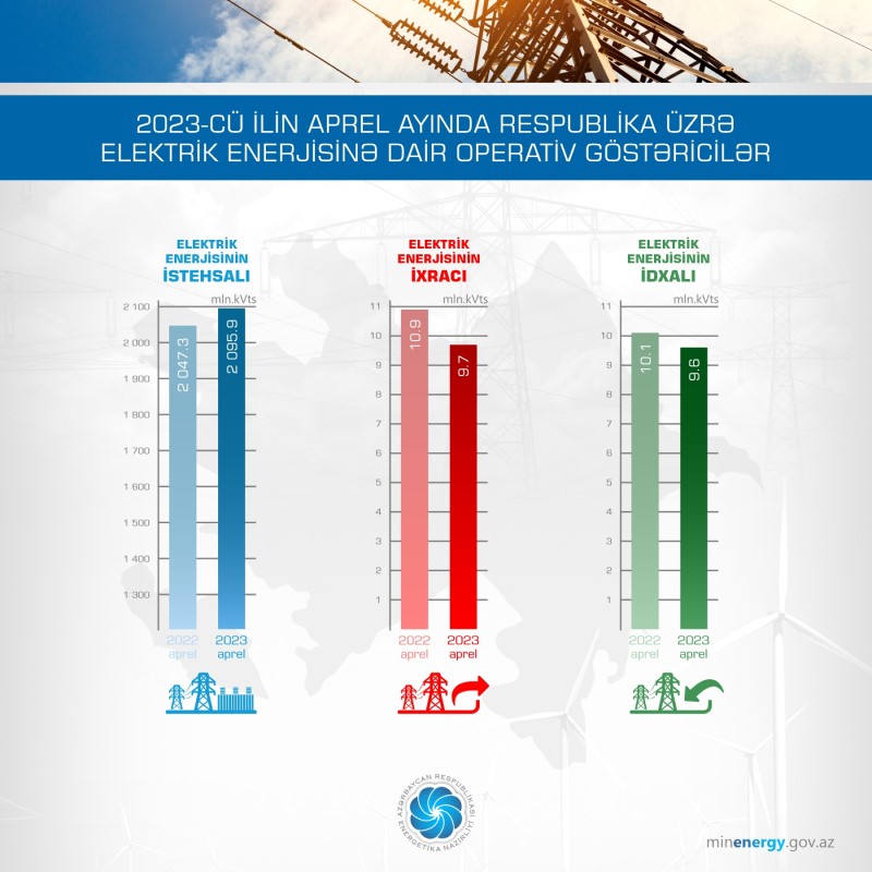 Qeyd edək ki, 2023-cü ilin aprel ayında respublika üzrə elektrik enerjisinin istehsalı ötən ilin müvafiq dövrü ilə müqayisədə 48,6 mln. kVt·st və ya 2,4 % artaraq 2095,9 mln. kVt·st olub. Aprel ayında elektrik enerjisinin idxalı 9,6 mln. kVt·st, ixrac isə 9,7 mln. kVt·st təşkil edib.