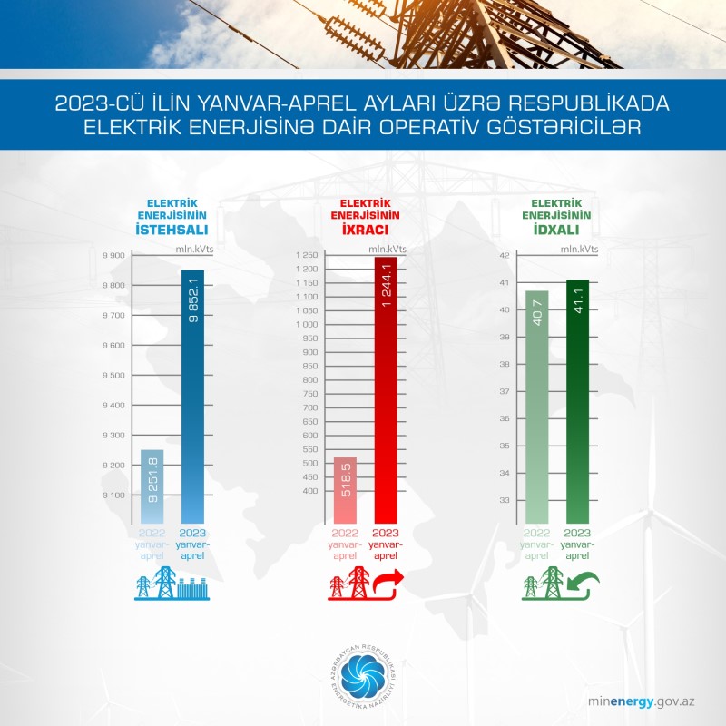 2023-cü ilin yanvar-aprel ayları ərzində elektrik enerjisinin idxalı 41,1 mln. kVt·st olmaqla, 2022-ci ilin müvafiq dövrü ilə müqayisədə 0,4 mln. kVt·st, ixrac isə 1 244,1 mln. kVt·st olmaqla, ötən ilin müvafiq dövrünə nisbətən 725,6 mln. kVt·st artıb.
