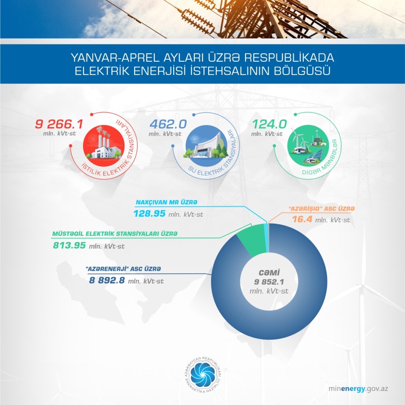 Hesabat dövründə elektrik enerjisinin istehsalı keçən ilin yanvar-aprel aylarına nisbətən İES-lərdə 633,2 mln. kVt·st artaraq 9 266,1 mln. kVt·st, SES-lərdə 30,8 mln. kVt·st azalaraq 462,0 mln. kVt·st, digər mənbələr üzrə isə 2,1 mln. kVt·st azalaraq 124,0 mln. kVt·st təşkil edib. Bu dövrdə külək elektrik stansiyalarında 21,4 mln. kVt·st, günəş elektrik stansiyalarında 19,1 mln. kVt·st, Bərk Məişət Tullantılarının Yandırılması Zavodunda isə 83,5 mln. kVt·st elektrik enerjisi istehsal edilib.