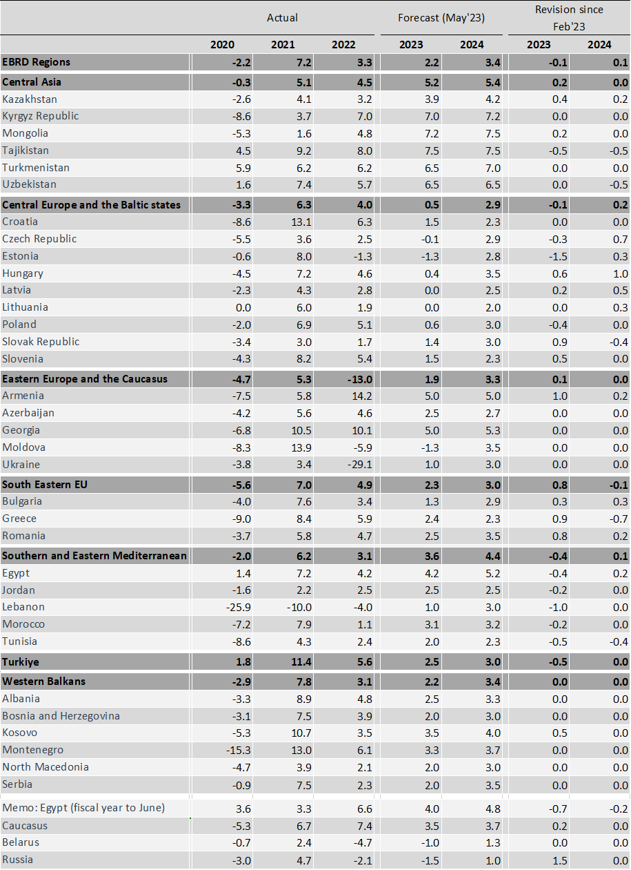 2022-ci ildə iqtisadi fəaliyyəti təşviq edən fövqəl amillər məhdud əlavə stimul yaratdığından, Şərqi Avropa və Qafqazda (Ukrayna istisna olmaqla) artımın zəifləyəcəyi gözlənilir. Bütövlükdə regionda 2023-cü ildə 1,9 faiz, 2024-cü ildə isə 3,3 faiz artım proqnozlaşdırılır.