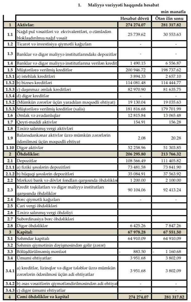 Mərkəzi Bankın yaydığı məlumatda bildirilir ki, Bank tərəfindən Fonda təqdim olunmuş hesabatlara əsasən 2023-cü ilin I rübünün sonuna Bank üzrə sığortalanmış (kompensasiya olunan) əmanətlər 38,5 milyon manat təşkil edir. Qeyd edilib ki, Bankın əmanətçilərinin say etibarı ilə 99,9%-nin əmanətləri kompensasiya olunacaqdır.