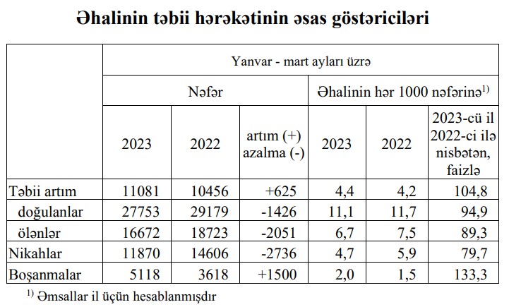 2023-cü ilin ilk üç ayı ərzində Ədliyyə Nazirliyinin rayon (şəhər) qeydiyyat şöbələri tərəfindən ölkə üzrə 27 753 doğulan körpə qeydə alınmış və 2022-ci ilin müvafiq dövrü ilə müqayisədə əhalinin hər 1000 nəfərinə bu göstərici azalaraq 11,7-dən 11,1-ə düşmüşdür.