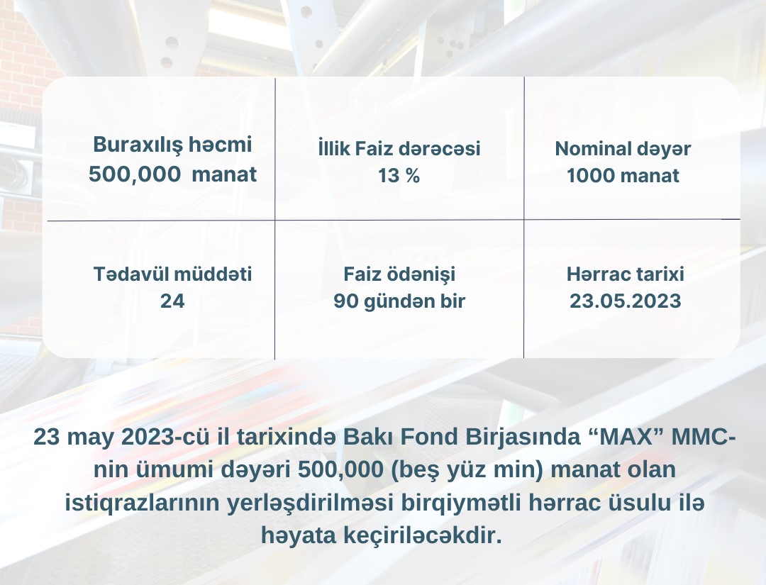 23 may 2023-cü il tarixində Bakı Fond Birjasında “MAX” MMC-nin ümumi dəyəri 500 min manat olan istiqrazlarının yerləşdirilməsi birqiymətli hərrac üsulu ilə həyata keçiriləcəkdir.