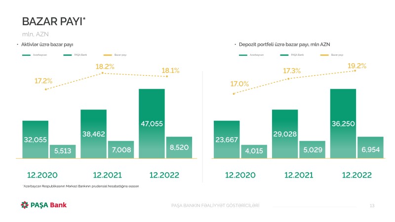 2022-ci ildə 2021-ci illə müqayisədə "PAŞA Bank"ın aktivlər, müştərilərə verilən kreditlər, korporativ kreditləşmə üzrə bazar payları azalıb, depozit portfeli üzrə artıb. Bankın depozit portfeli (fiziki və hüquqi şəxslərin depozitləri) üzrə bazar payı 2021-ci ildəki 17.3%-dən 19.2%-ə yüksəlib. 2022-ci ilin sonunda bank sektorunun cəmi depozit portfeli 36 milyard 250 milyon manat, o cümlədən PAŞA Bankın depozit portfeli 6 milyard 954 milyon manat təşkil edib.
