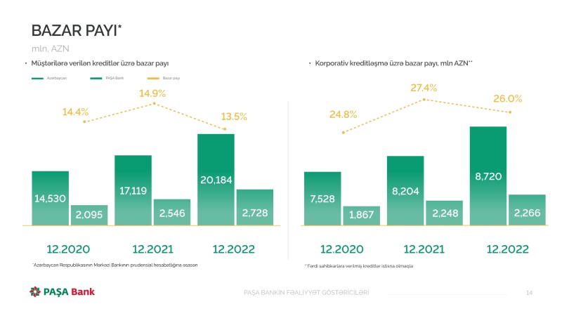 Marja.az-ın məlumatına görə, 2022-ci il üzrə fəaliyyət nəticələrinə həsr olunmuş mətbuat konfransında "PAŞA Bank"ın İdarə Heyətinin sədri və Baş icraçı direktoru Cavid Quliyev bildirib ki, 2022-ci ildə Bankın aktivlər üzrə bazar pay 18,1%, müştərilərə verilən kreditlər üzrə bazar payı 13.5%, korporativ kreditləşmə üzrə bazar payı 26%, depozit portfeli üzrə bazar payı 19.2% təşkil edib.