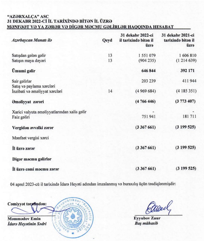 2022-ci ilin sonunda "Azərxalça"nın yığılmış zərəri 20 milyon 406 min manata çatıb. 2021-ci ilin sonunda Şirkətin yığılmış zərəri 17 milyon 39 min manat təşkil etmişdi.