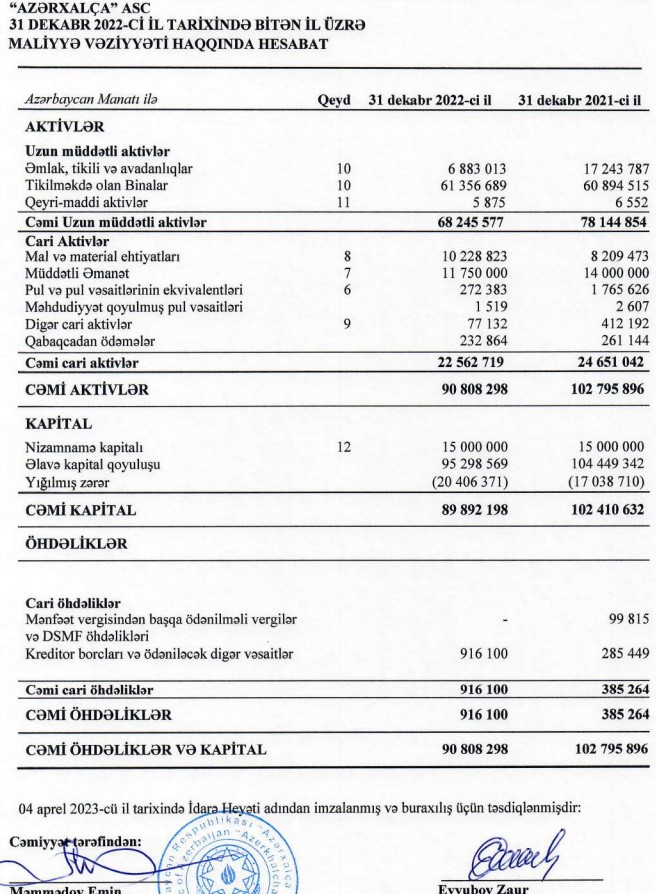 Ötən il "Azərxalça"nın cəmi aktivləri 11 milyon 988 min manata azalaraq 2021-ci ilin sonundakı 102 milyon 796 min manatdan 90 milyon 808 min manata düşüb.