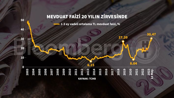Marja xəbər verir ki, Türkiyə Cümhuriyyəti Mərkəzi Bankının (TCMB) məlumatlarına görə, 1-3 aylıq əmanətlərdə faiz dərəcəsi 12 May həftəsində 30 faizdən yuxarı qalxıb. Belə ki, 2003-cü ilin oktyabrından bəri ilk dəfə olaraq 1-3 ay müddətində əmanətlərin faizi 30 faizdən yüksək olub.