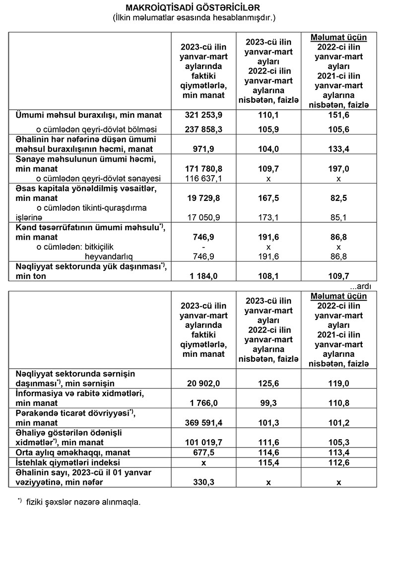 Məhsul buraxılışının həcmi 2022-ci ilin eyni dövrü ilə müqayisədə sənayedə 9,7 faiz, kənd təsərrüfatında 91,6 faiz, tikintidə 73,1 faiz, nəqliyyat və anbar təsərrüfatında 46,8 faiz, ticarət; nəqliyyat vasitələrinin təmirində 1,3 faiz artmış, informasiya və rabitə xidmətlərində 0,7 faiz azalmışdır.